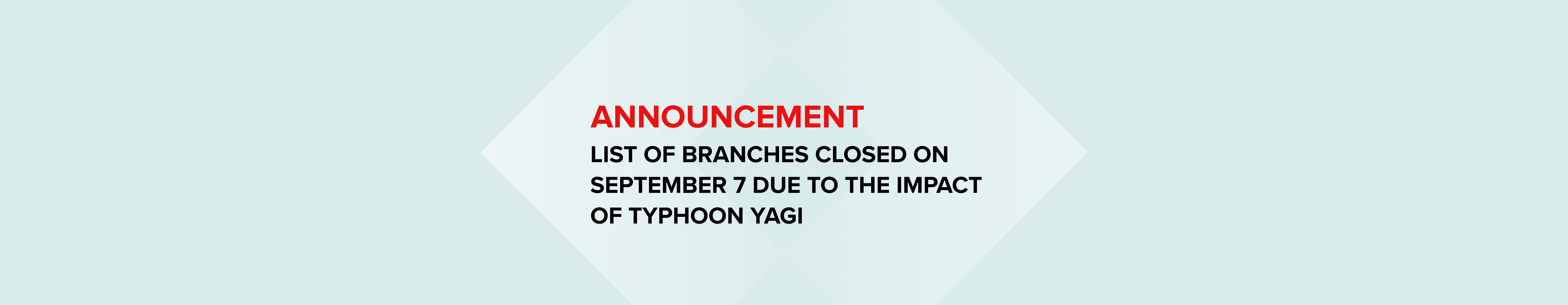 Due to the impact of typhoon Yagi, Techcombank would like to announce the list of branches that will be closed on September 07, 2024 to ensure safety.