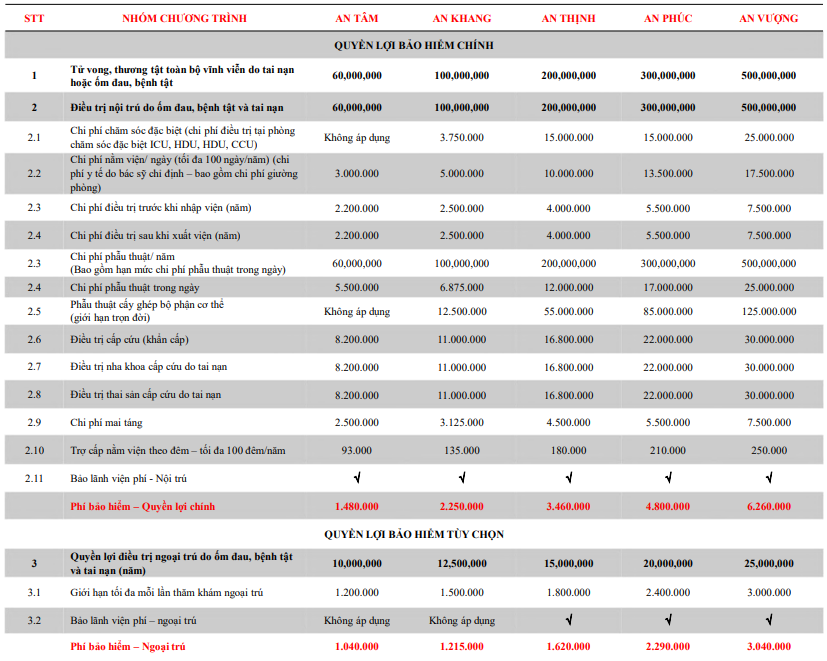 - Mức phí bảo hiểm cạnh tranh, cố định theo từng gói, không phân biệt theo độ tuổi;