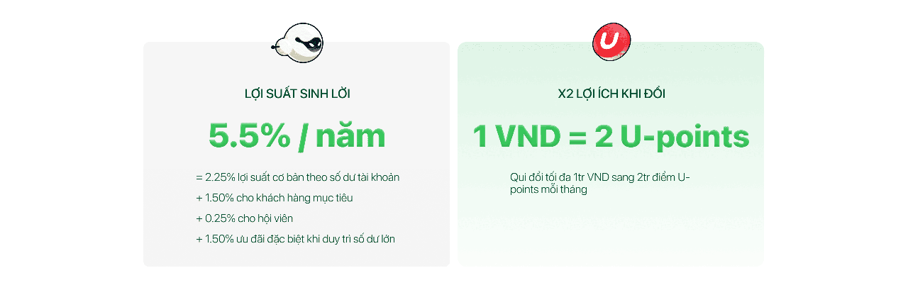Lợi ích tới 5.5%/năm khi 1 VND tiền lời quy đổi thành 2 điểm U-Point, sử dụng điểm đổi thành tiền, voucher hoặc thanh toán.
