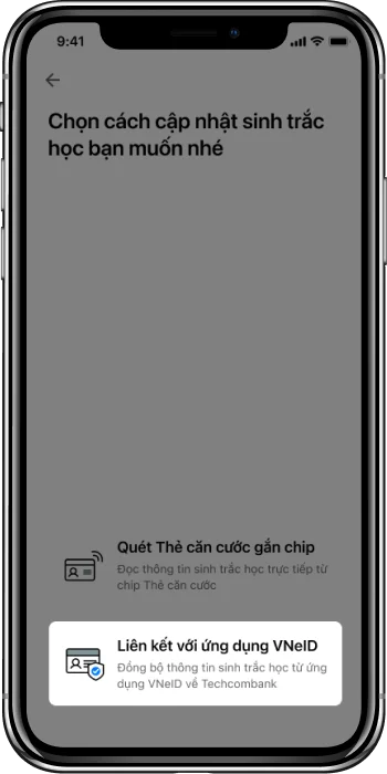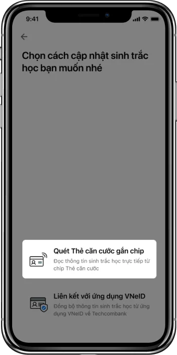 Để đảm bảo trải nghiệm liền mạch khi thực hiện bổ sung thông tin sinh trắc học bằng CCCD gắn chip, Techcombank hỗ trợ thêm cập nhật thông tin CCCD trên hệ thống khi Quý khách hoàn tất việc bổ sung thông tin sinh trắc học. Quý khách có thể cập nhật thông tin CCCD khi bổ sung thông tin sinh trắc học trên ứng dụng Techcombank Mobile (áp dụng với thiết bị hỗ trợ đọc thông tin chip NFC) hoặc tại các chi nhánh của Techcombank.