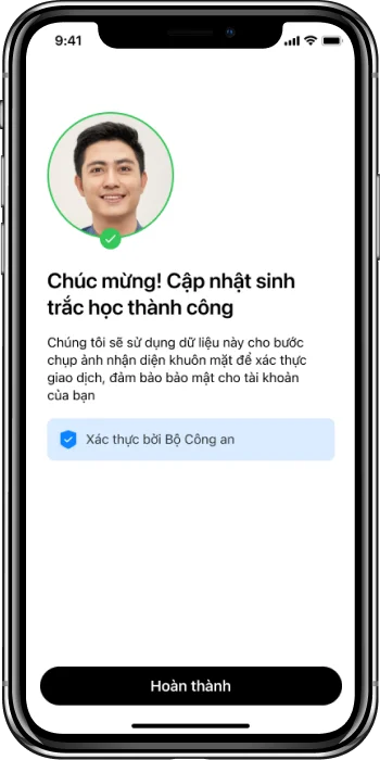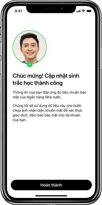 Cập nhật sinh trắc học được thực hiện bằng cách chụp ảnh bằng máy ảnh phía trước của điện thoại, vì vậy trong trường hợp thiết bị của Quý khách không có FaceID sẽ không bị ảnh hưởng.