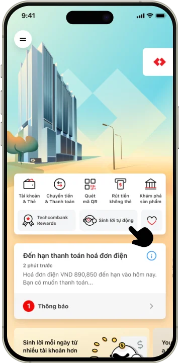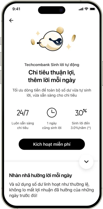 Sinh lời phải nhanh, tiền lời phải lớn, bật Sinh lời tự động 2.0 và tham gia ngay Sinh lời trúng lớn trên Techcombank Mobile để trúng căn hộ Masterise, trúng xe hơi VinFast, điện thoại iPhone, tai nghe Airpods cùng hàng triệu voucher và cà phê miễn phí
