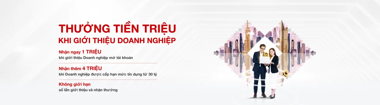 Với sứ mệnh dẫn dắt mỗi cá nhân và doanh nghiệp hành trình tài chính số, Techcombank tiếp tục triển khai chương trình “Tăng kết nối – Thêm thịnh vượng” dành riêng cho các khách hàng hiện hữu giới thiệu khách hàng doanh nghiệp mới với Techcombank, giúp thành công nhân đôi, ưu đãi gấp bội. Khách hàng sẽ nhận thưởng tiền TRIỆU cho mỗi lần kết nối thành công chỉ với 4 bước đơn giản: