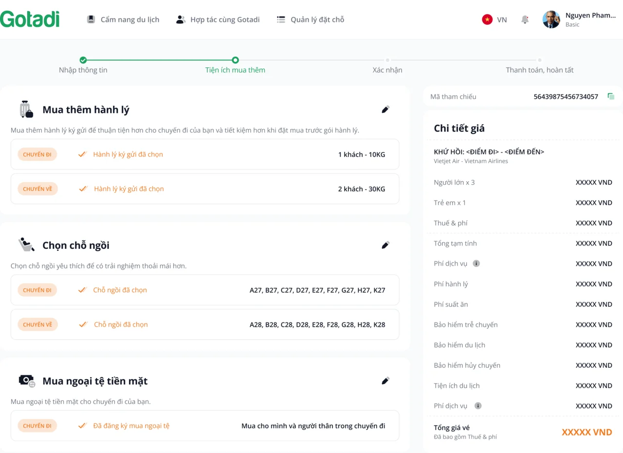 Bước 1: Truy cập website/ứng dụng Gotadi để tiến hành đặt vé máy bay. Điền thông tin theo hướng dẫn. Sau khi điền thông tin và chuyển đến mục “Tiện ích mua thêm”, nhấn chọn “Mua ngoại tệ” và lựa chọn “Mua cho mình và người thân trong chuyến đi” hoặc “Mua cho nhóm khách hàng” theo nhu cầu.