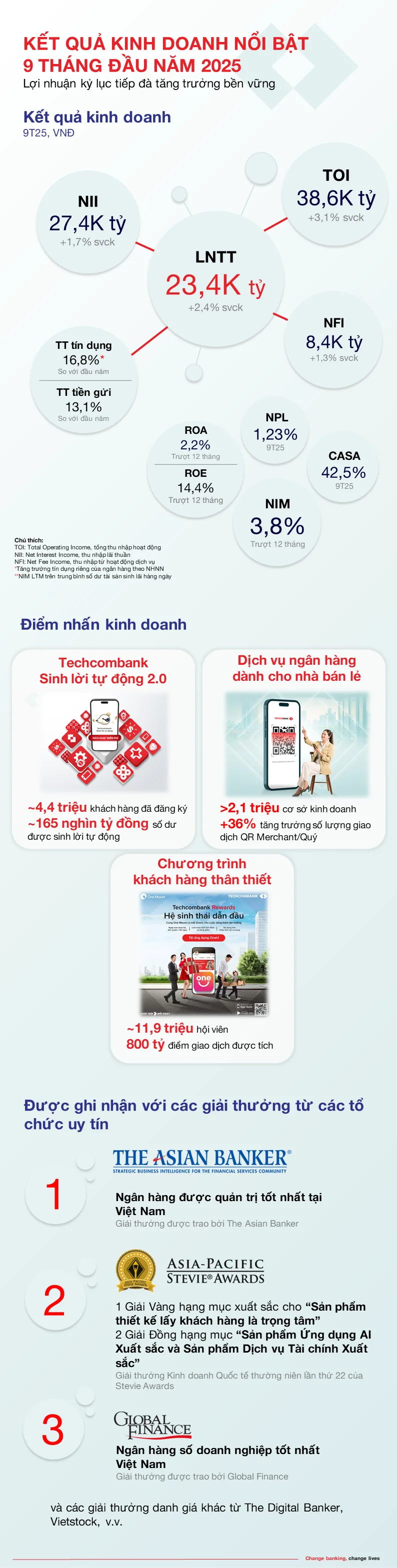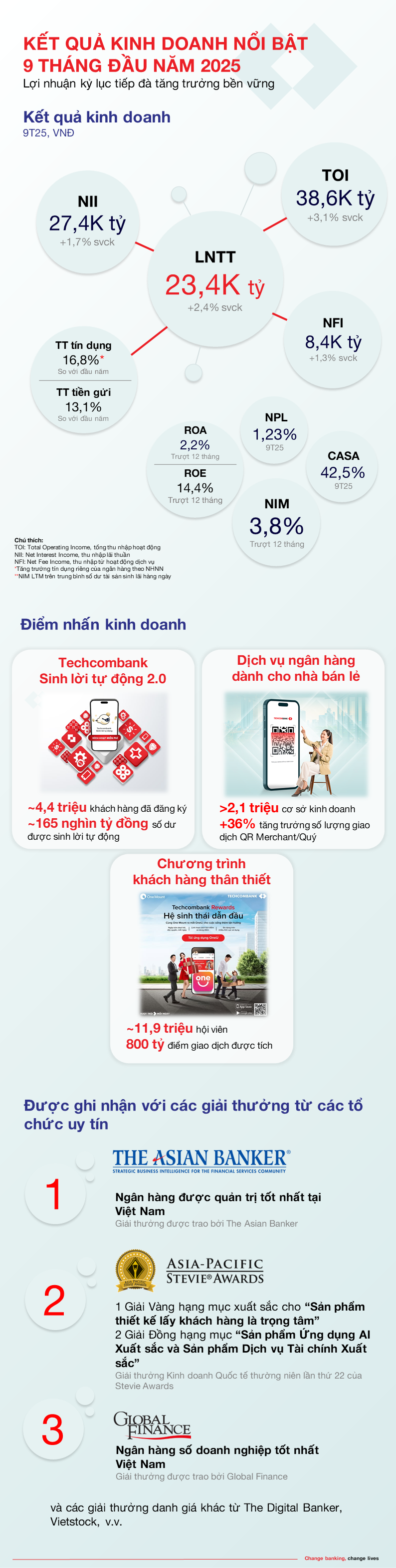 Thành công của chiến lược chuyển đổi và vị thế hệ sinh thái tài chính hàng đầu tại Việt Nam đã được tạp chí The Asian Banker ghi nhận, vinh danh Techcombank là Ngân hàng quản trị tốt nhất Việt Nam giai đoạn 2022 - 2025”