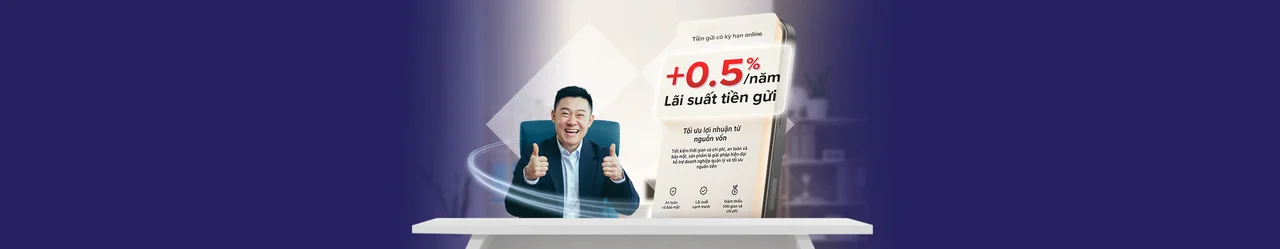 Với mong muốn đồng hành cùng doanh nghiệp trong việc tối ưu dòng vốn, Techcombank mang đến ưu đãi cộng thêm đến 0.5%/năm lãi suất cho hợp đồng tiền gửi đầu tiên. Không chỉ giúp doanh nghiệp gia tăng lợi nhuận từ nguồn tiền nhàn rỗi mà còn chủ động xây dựng kế hoạch tài chính hiệu quả và bền vững.