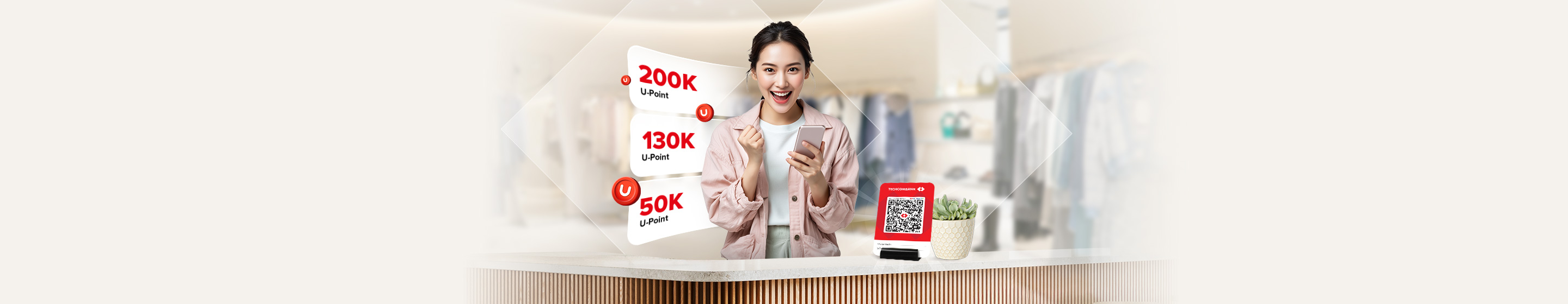 Kinh doanh nay càng thêm lợi ích! Với 100 giao dịch qua QR cửa hàng và thanh toán hóa đơn trên Techcombank Mobile, chủ shop có thể dễ dàng rinh đến 380,000 điểm U-Point để đổi quà, mua sắm thả ga. Đừng bỏ lỡ!
