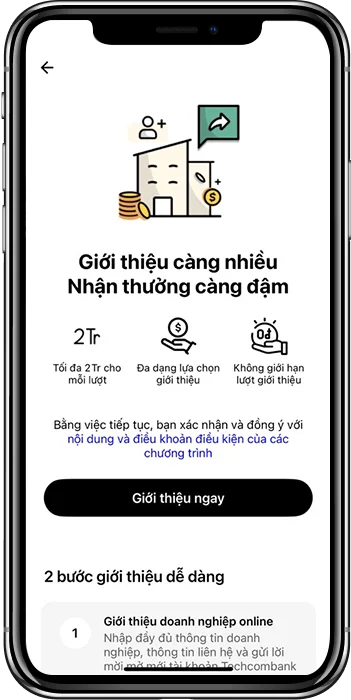 Techcombank tiếp tục triển khai chương trình Giới thiệu doanh nghiệp mới mở tài khoản với những phần thưởng hấp dẫn. Chỉ với 2 phút thực hiện giới thiệu online, chương trình mang đến những giá trị thiết thực cho cả người giới thiệu lẫn doanh nghiệp được giới thiệu.