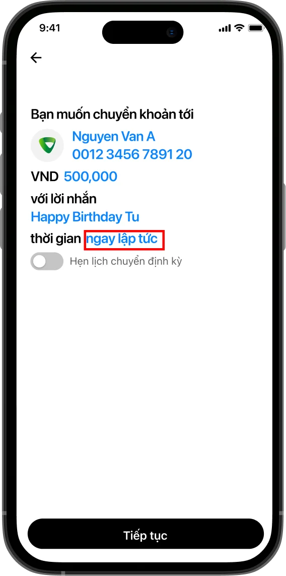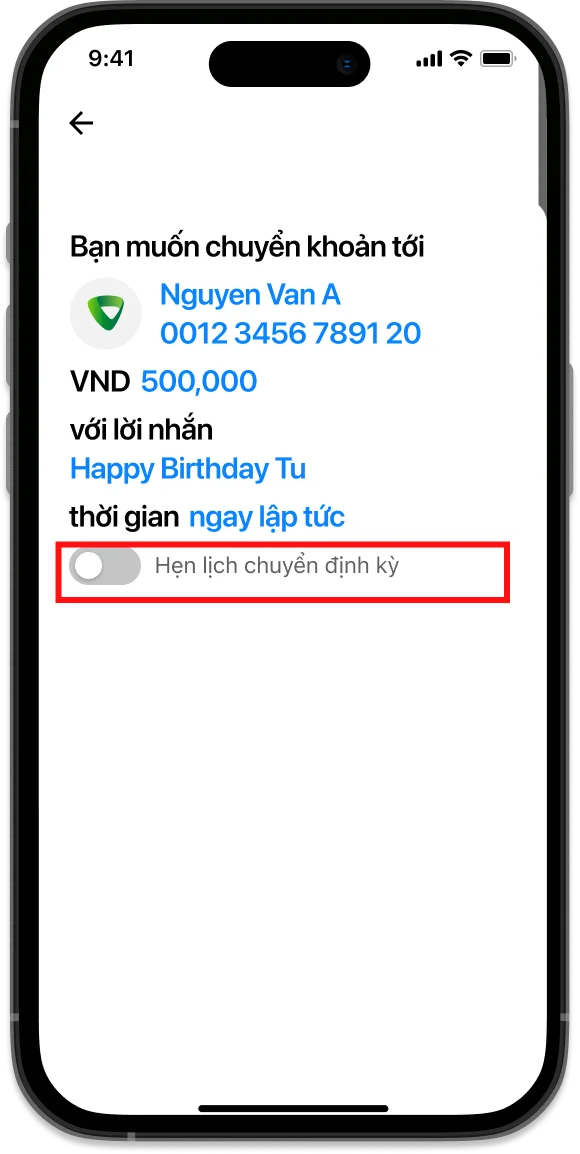 Sau khi hoàn tất thông tin người nhận tiền, chọn “Hẹn lịch chuyển định kỳ”
