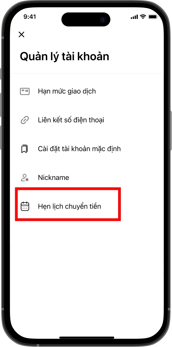 Chọn “Cài đặt” > “Quản lý tài khoản” > “Hẹn lịch chuyển tiền”