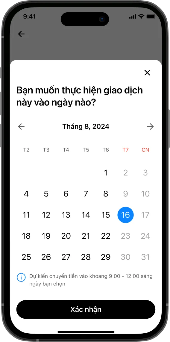 Chọn thời điểm bạn muốn thực hiện giao dịch và xác nhận