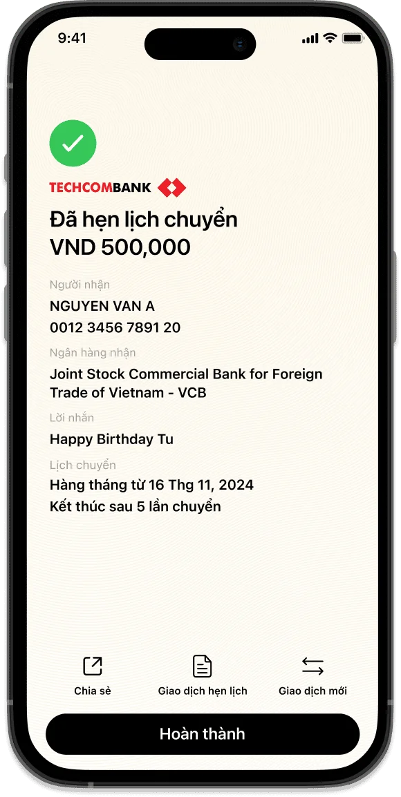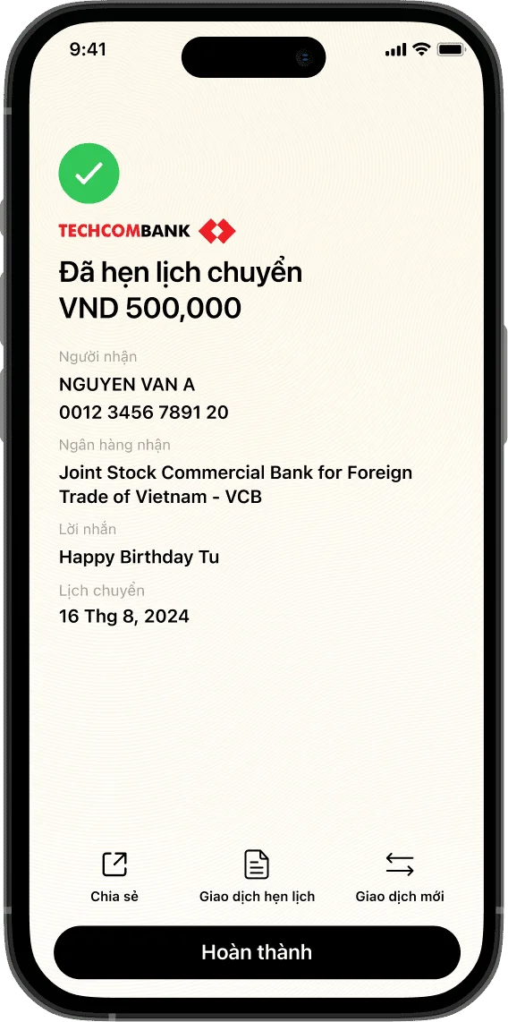 Giờ đây, bạn không cần lo lắng về việc quên lịch chuyển tiền hay bỏ lỡ những khoản quan trọng. Chỉ với vài thao tác đơn giản, bạn đã có thể thiết lập lịch chuyển tiền theo lịch, tiết kiệm thời gian và tập trung xử lý những công việc cá nhân.