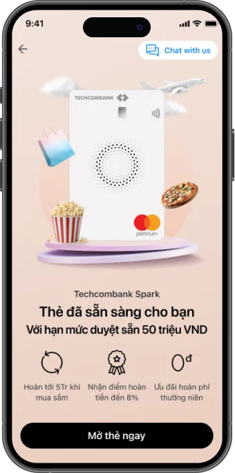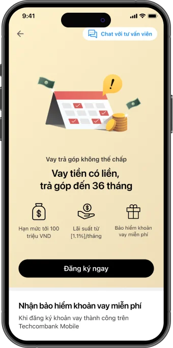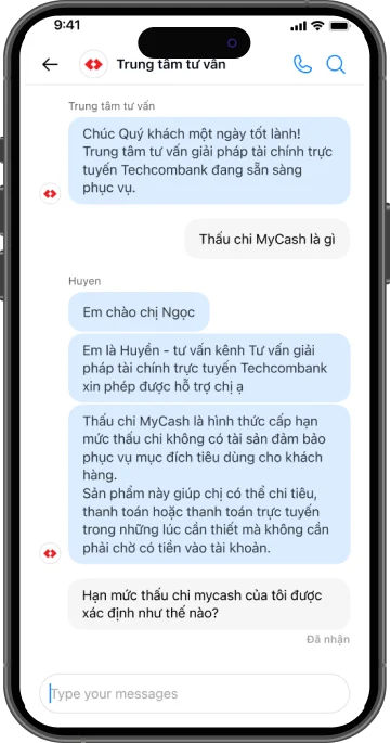 Nhằm mang đến sự thuận tiện và hỗ trợ nhanh chóng ngay khi cần, khách hàng có thể dễ dàng trao đổi trực tuyến với tư vấn viên ngay trên Techcombank Mobile, áp dụng khi truy cập sản phẩm Vay trả góp không thế chấp, Bảo hiểm (Bảo hiểm toàn diện nhà tư nhân, Bảo hiểm xe cơ giới), một số dòng thẻ tín dụng, Vay thấu chi MyCash và Sinh lời tự động.