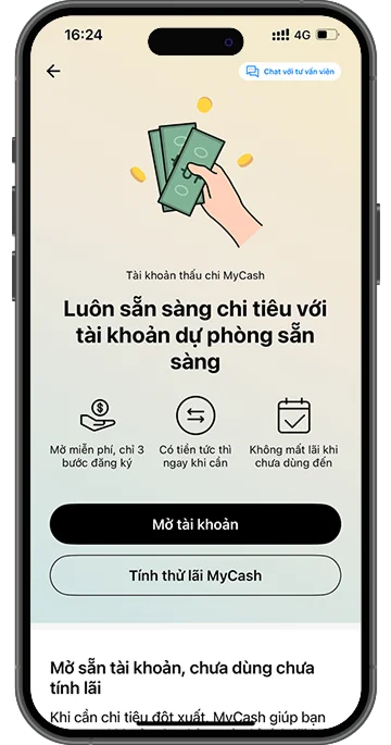 Bước 2: Nhấn chọn “Chat với tư vấn viên” tại màn hình chính của sản phẩm (minh họa với sản phẩm Vay thấu chi MyCash)