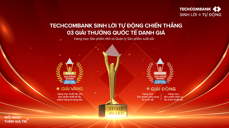 Hà Nội, Ngày 09 tháng 09 năm 2025 - Sản phẩm Techcombank Sinh Lời Tự Động 2.0 của Ngân hàng TMCP Kỹ Thương Việt Nam (Techcombank) vừa chính thức giành giải Vàng Stevie® ở Hạng mục Xuất sắc cho Sản phẩm thiết kế lấy khách hàng là trọng tâm. Bên cạnh đó, Techcombank cũng được trao hai giải Đồng Stevie® cho các hạng mục Sản phẩm Ứng dụng AI Xuất sắc nhất và Sản phẩm Dịch vụ Tài chính Xuất sắc. Cả ba giải thưởng này đều nằm trong khuôn khổ Giải thưởng Kinh doanh Quốc tế thường niên lần thứ 22 (International Business Awards®) do Stevie Awards tổ chức.