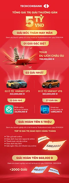 Chương trình ưu đãi lớn nhất năm dành cho khách hàng doanh nghiệp vừa và nhỏ tham gia giao dịch trên ngân hàng số Techcombank từ 12/11/2024 đến hết 31/1/2025.