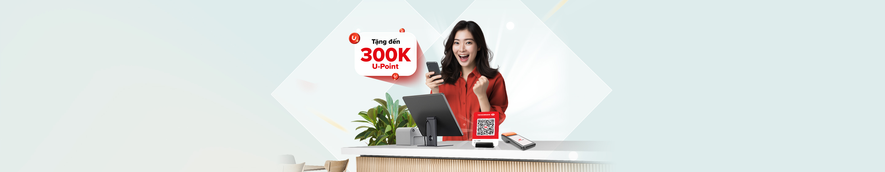 Cửa hàng càng nhiều đơn, điểm thưởng càng hấp dẫn! Chỉ cần nhận thanh toán QR hay thẻ, chủ shop có thể rinh ngay đến 300K U-Point – đổi voucher, hoàn tiền cực dễ. Giao dịch liền tay để không bỏ lỡ!