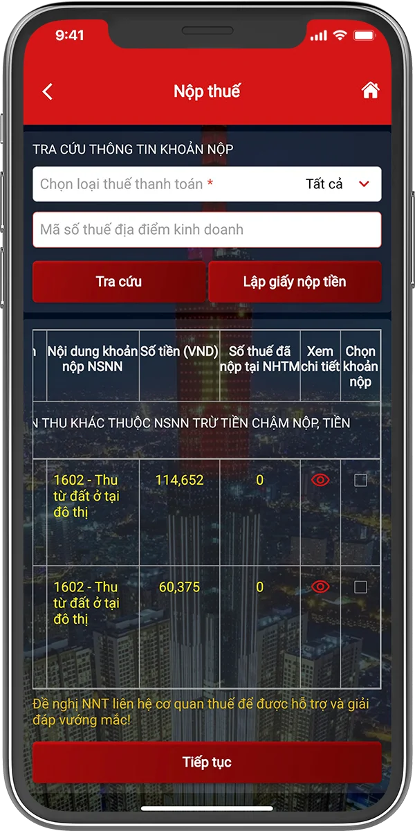 Tra cứu thông tin khoản nộp và chọn khoản thuế cần thanh toán