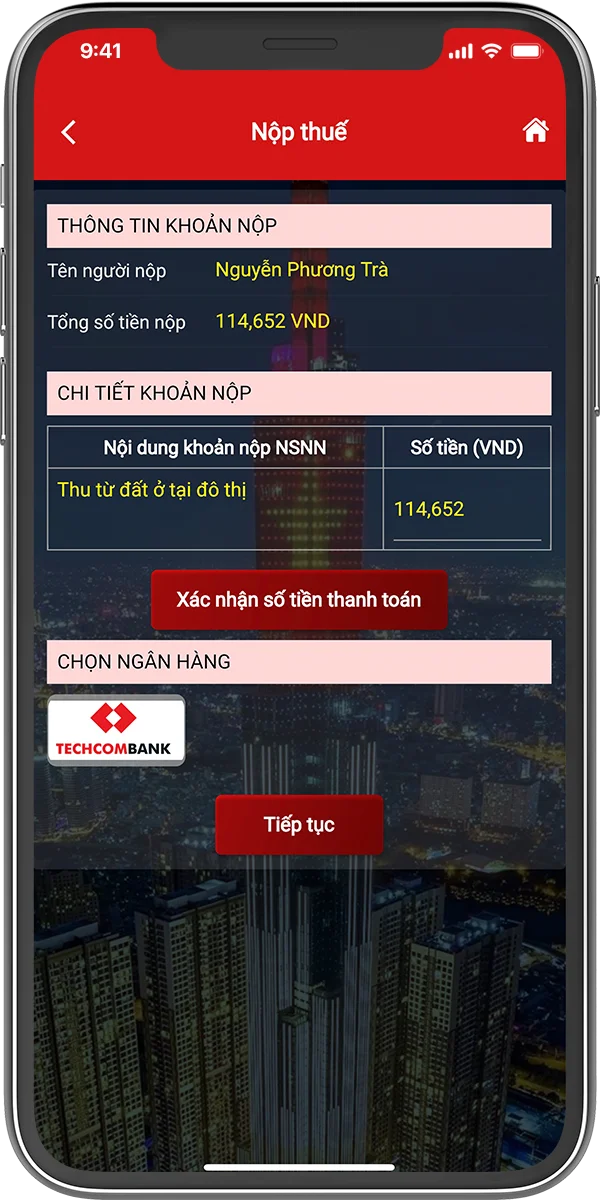 Triển khai dịch vụ Nộp thuế nội địa dành cho khách hàng cá nhân trên eTax Mobile của Tổng cục thuế, giúp khách hàng hoàn thành nghĩa vụ nộp thuế thuận lợi nhất thông qua việc liên kết tài khoản thanh toán tại Techcombank