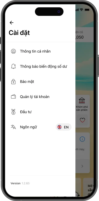 Bước 1: Tại màn hình chính của Techcombank Mobile, vào “Menu”, chọn “Cài đặt”.