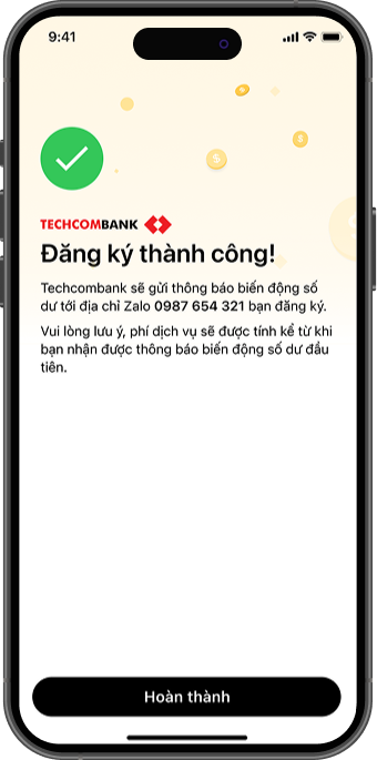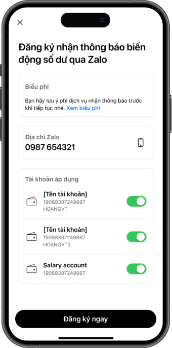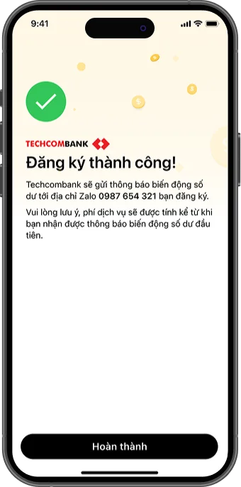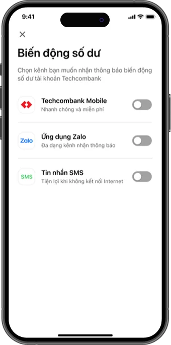 Nhằm giúp khách hàng thuận tiện theo dõi biến động số dư tài khoản, từ ngày 01/09/2025, Techcombank triển khai dịch vụ nhận tin nhắn biến động số dư tài khoản thanh toán qua Zalo. Khách hàng có thể lựa chọn đăng ký sử dụng bên cạnh các hình thức thông báo hiện có qua Techcombank Mobile (miễn phí) và SMS (có phí).