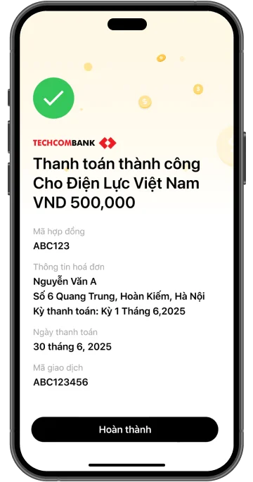 Theo tiêu chuẩn kỹ thuật mới của Tổng công ty Điện lực Việt Nam, để tránh gián đoạn thanh toán hóa đơn điện, từ tháng 06/2025, các khách hàng đã đăng ký thanh toán hóa đơn điện tự động đối với các nhà cung cấp EVNCPC/EVNSPC/EVNNPC/EVNHANOI/EVNHCMC tại quầy cần đăng ký lại dịch vụ thanh toán hóa đơn điện tự động trên Techcombank Mobile hoặc thanh toán thông qua các hình thức mà các nhà cung cấp chấp thuận.
