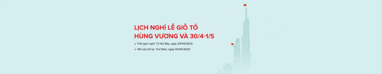 Nhằm đảm bảo thực hiện các giao dịch và phục vụ tốt nhất cho nhu cầu của khách hàng, Ngân hàng Thương mại cổ phần Kỹ Thương Việt Nam (Techcombank) trân trọng thông báo đến quý khách hàng thời gian nghỉ lễ Giỗ tổ Hùng Vương và 30/4-1/5 năm 2023 như sau: